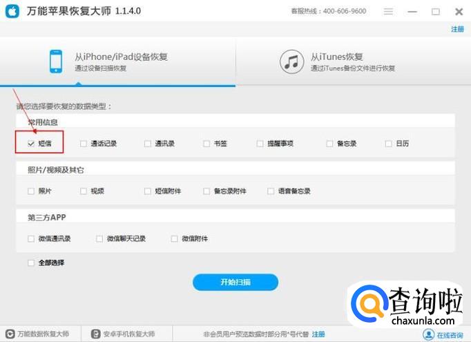 接着运行软件,和手机识别连接成功,在选择数据类型上勾选短信进行扫描。