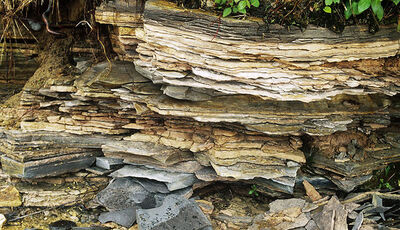 页岩是一种由黏土脱水胶结而成的岩石。由黏土物质硬化形成的微小颗粒易裂碎,很容易分裂成为明显的岩层。用硬物击打易裂成碎片。由粘土物质经压实作用、脱水作用、重结晶作用后形成。