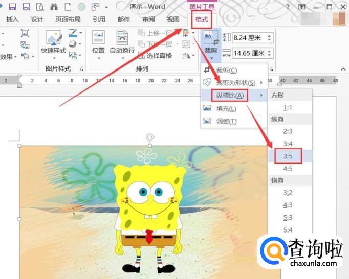 插入一张需要打印的证件照片,选中照片,切换到“格式”选项卡,在“裁剪”下拉菜单中点击“纵横比”,在下拉菜单中选中“3:5”,或者其它比例。
