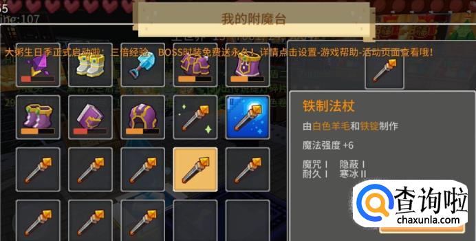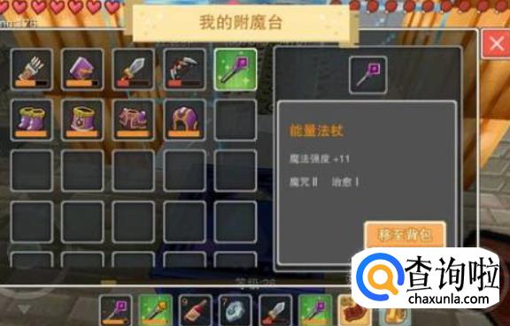点击附魔台打开附魔界面,可附魔的武器/装备/工具会显示在下面的显示框,选择想要附魔的道具,放入附魔台。可能不会一次就出奶三,需要等大约半分钟,再用一把垫子重新附魔。