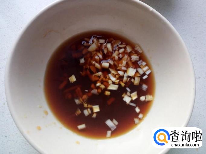 碗里放入一匙儿蚝油,少许白糖,酱油,少许盐,味精,料酒,放入切好的葱,姜,蒜,兑少量的水,调和成料汁。