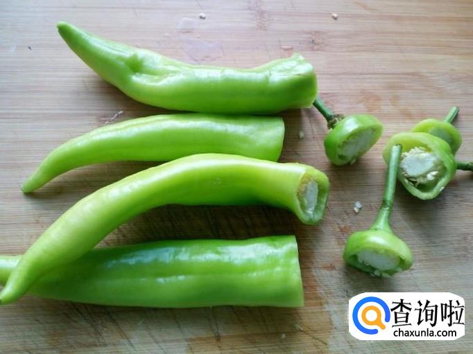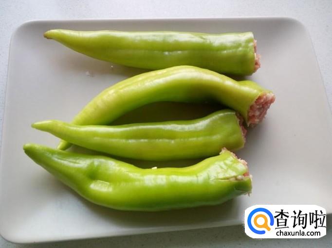 把控好水的青尖椒,在根部切开,清除里面的辣椒籽。然后用筷子把调拌好的肉馅放入青尖椒里(用筷子慢慢填满)。