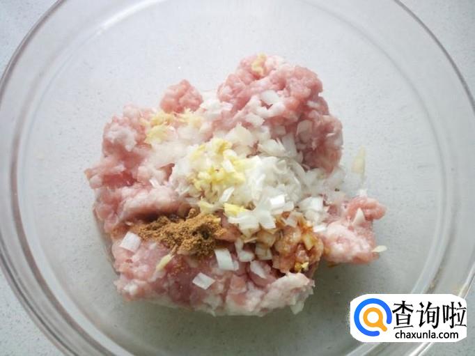 把切好的葱,姜末放入肉馅中,放入五香粉,盐,味精,料酒,少许油,搅拌均匀,粘稠。