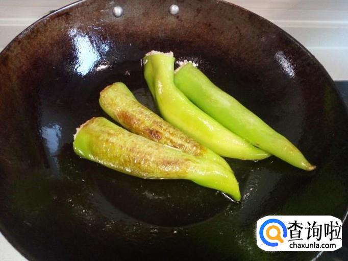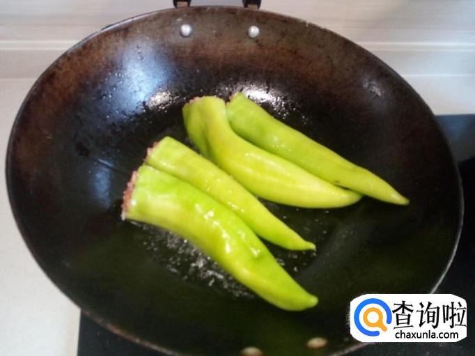 锅内放入比平时炒菜多一些的油加热,油热后把青尖椒放入锅中,小火煎炸。