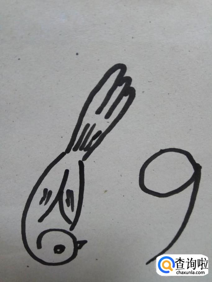 第五步,画出数字9部分小鸟的尾巴,同时用小线段,丰富一下小鸟的羽毛。