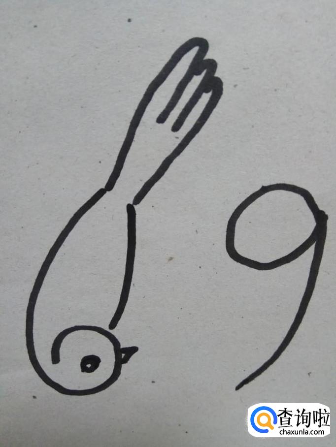 第四步,画出数字9部分小鸟的眼睛和嘴巴。同时画出数字9部分小鸟的羽毛,相当于在9的小尾巴的左边画一个斜n,同时在身体右面,再画一撇。