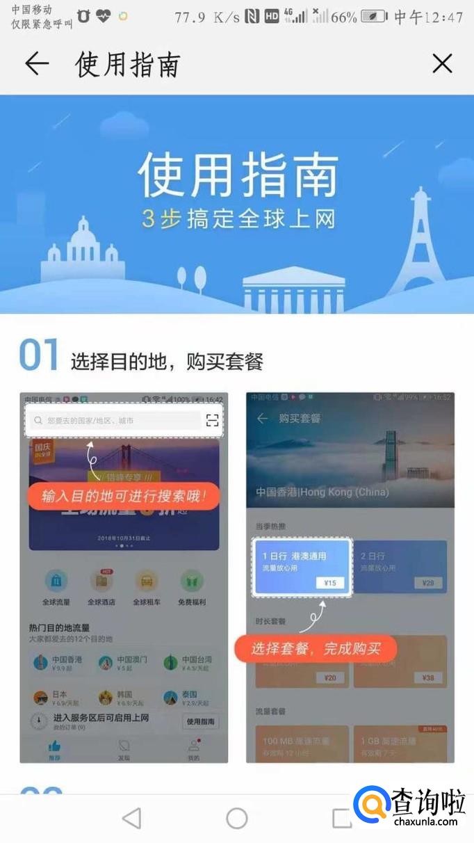 这是“使用指南”的说明书,手机上一般有自带的智能服务,如果到达该目的时手动启用流量即可,三十天内使用,如果未使用有些国家的流量包是可以退还金额的。