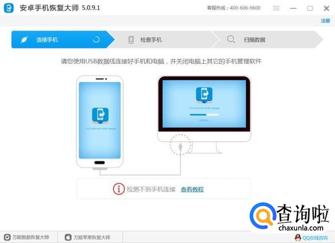 运行安装好的软件,在界面上可以看到会提示你连接手机。按照提示,使用数据线把手机连接到电脑上。
