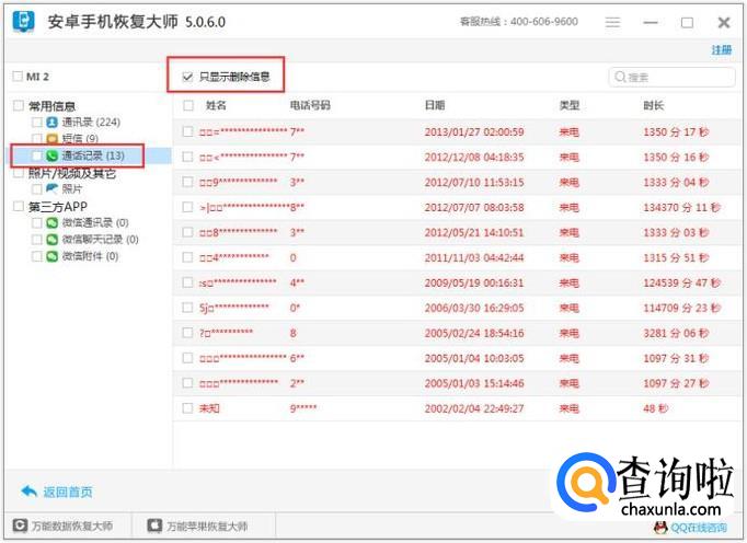 扫描结束后,在界面上可以看到删除过的通话记录。然后全部选择要恢复的记录,点击下方的恢复按键,就可以恢复vivoX20手机上的通话记录数据。