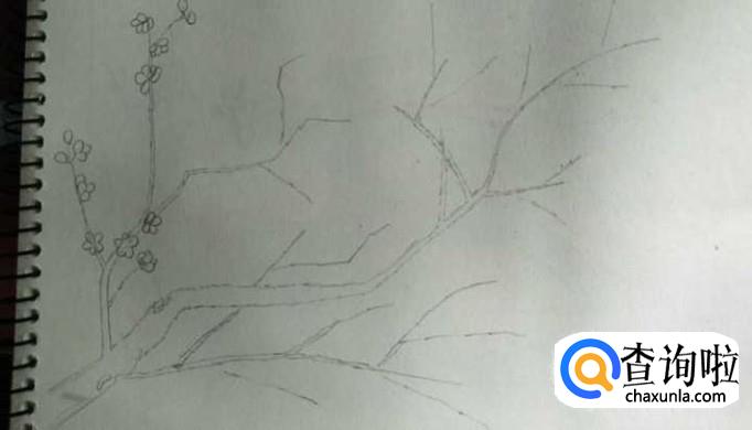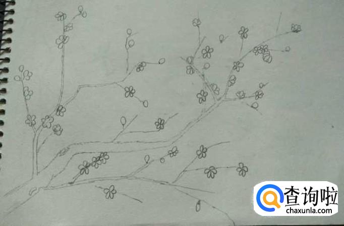 接下来,我们画出梅花,这个不需要太多的技巧,就用我们小学画花的基础就能够画好,直接画出5瓣花瓣的小花即可,如下图所示,当然,在枝条的最尖端我们还是要画出一些含苞待放的小花骨朵,如下图,直接用一个小椭圆代替就可以了