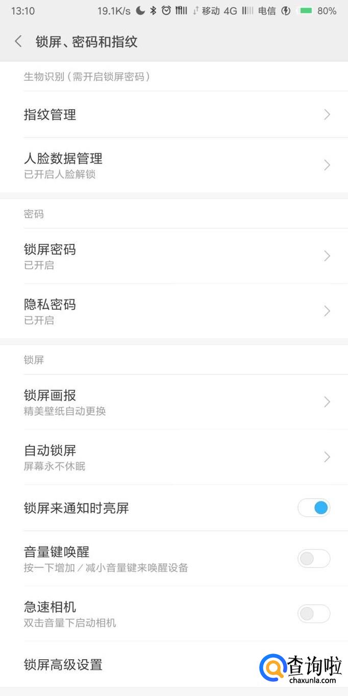 里面可以设置指纹、人脸识别、图案密码等,选择最后一项锁屏高级设置;