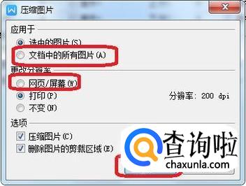 此时,我们可以选中“文档中所有图片”,然后更改分辨率(一般网页格式是分辨率最小的,只有96dpi),然后点击确定,就可以压缩文档中所有图片,减小文件体积。