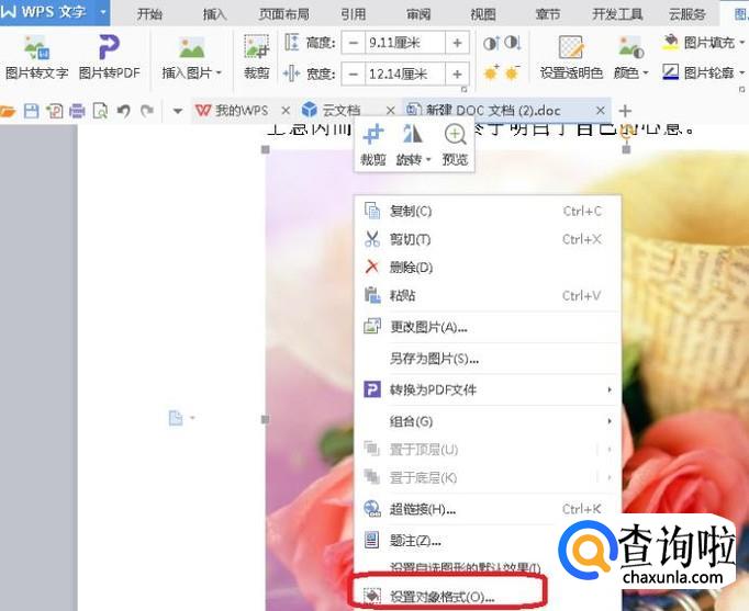 如果是文本文档,一般都是因为图片容量太大,才造成文件过大,我们用WPS打开文档后,任意选择一张图片,右键点击选择“设置对象格式”。