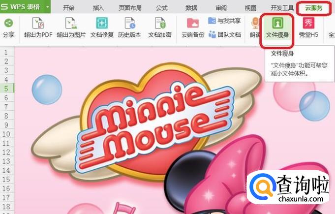 如果是表格文档,我们用WPS打开后,如图所示,点击菜单栏“云服务”,下方功能区有一个“文件瘦身”图标,我们点击一下。