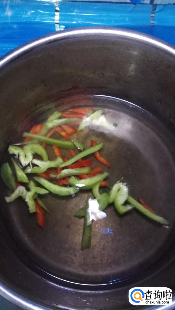 再准备适量青红椒,将青红椒洗净后切成丝,倒入锅中焯水,这里选用的青红椒是菜椒,所以焯水后更好吃。