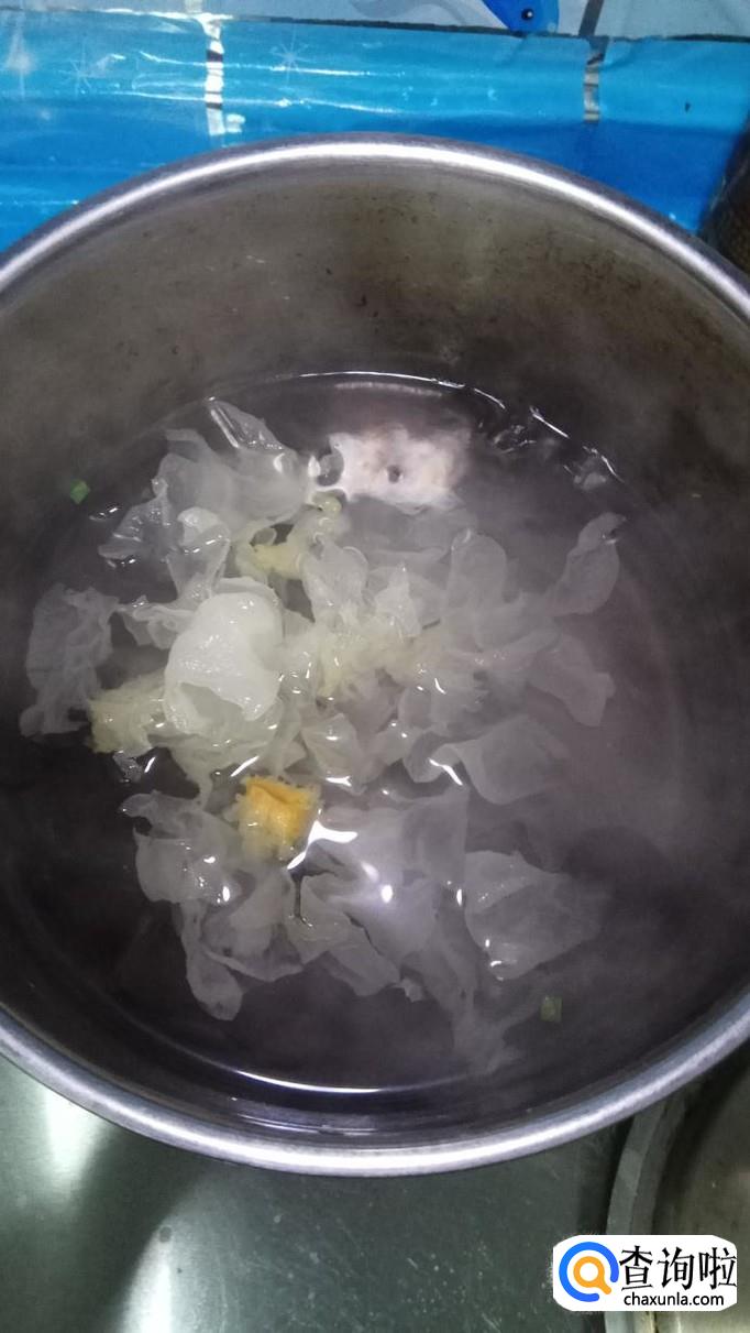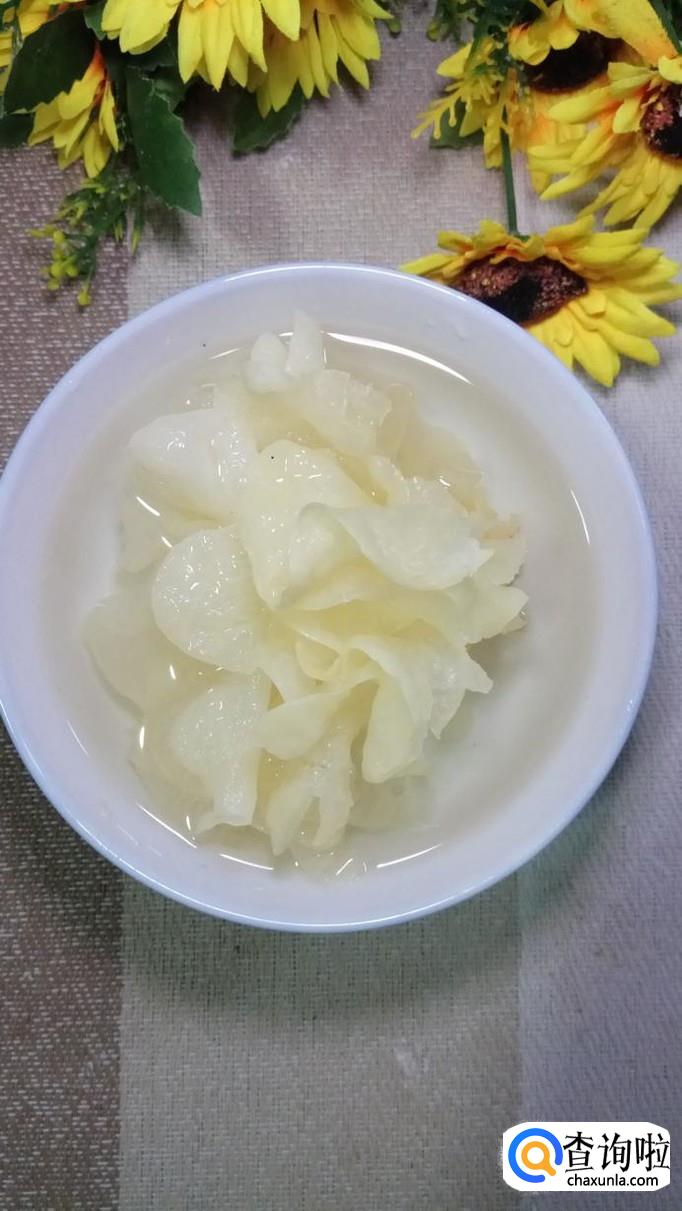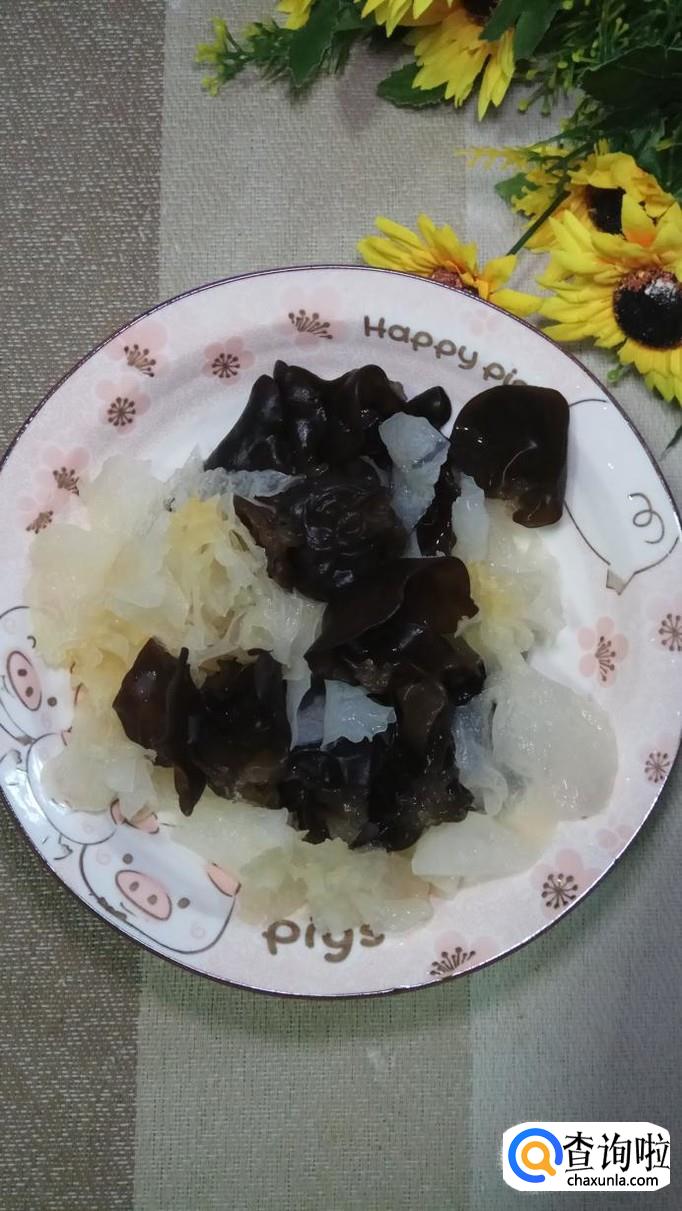 准备适量银耳和黑木耳,用水泡发,在冷水中,加入少许白醋,很快就泡发了。