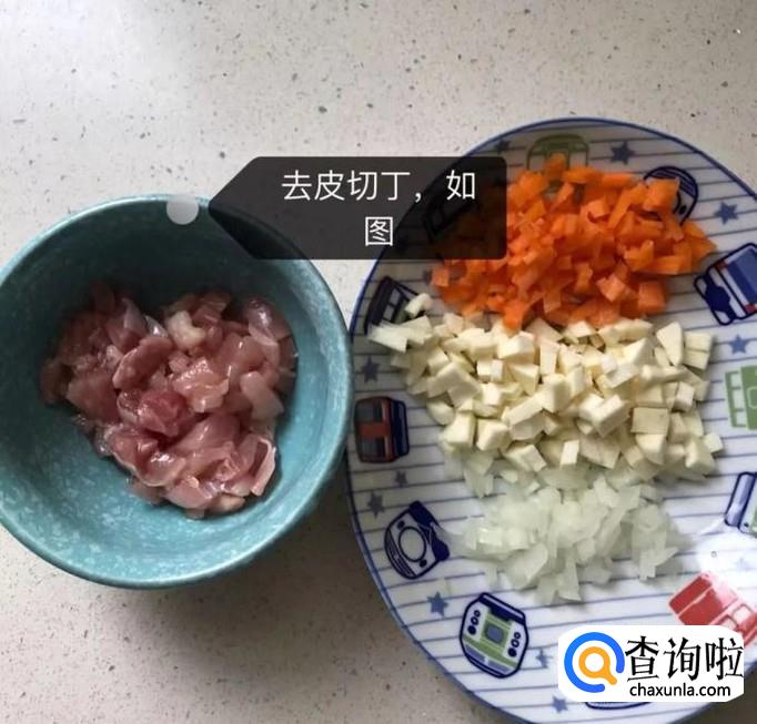 接着等到食材断生以后,下入鸡腿丁翻炒至变色,加入半碗水,如下图所示。