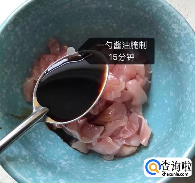 接着在鸡腿肉中加入一勺的酱油腌制15分钟,如下图所示。