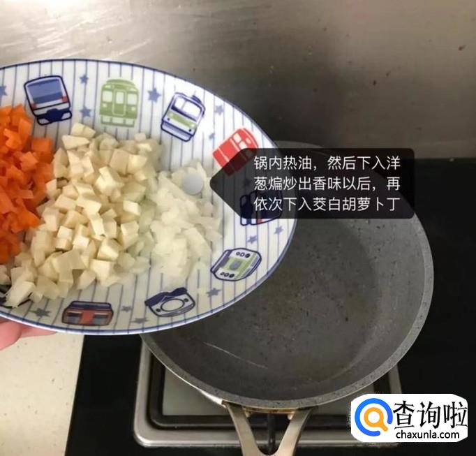 然后锅中放入适量的食用油,待油冒烟,下洋葱煸炒出香味,再依次下入茭白和胡萝卜丁翻炒两分钟,如下图所示。