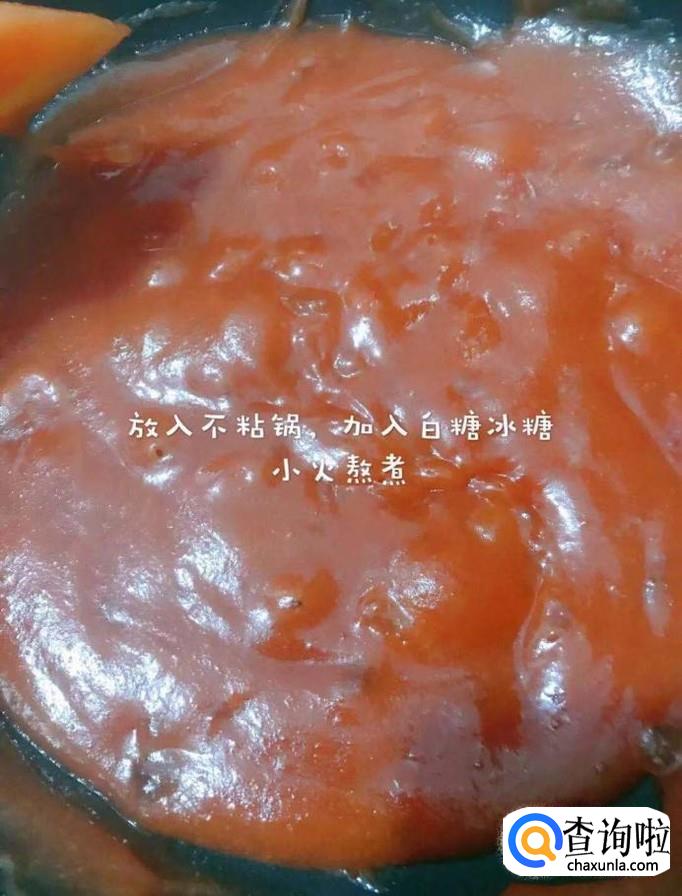 接着把山楂泥倒进不粘锅,加入白糖和冰糖,开小火熬制,如下图所示。小贴士:大家在熬山楂泥的过程当中,一定要用铲子不停翻动,避免粘锅。