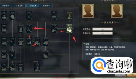 第一科技,非常重要的一项,前期只要把科技做好了,守城基本就毫无问题了。如图所示,首先我们出来先升级这三个科技。把这三个升级好了之后,我们继续升级下图的军事科技。前期只要投石车跟床弩在手,基本这天下就没人在我眼里了。