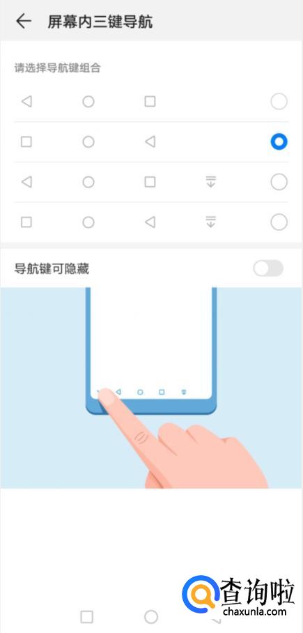 在屏幕内三键导航设置界面中,可以选择导航键的组合方式,选择好后,就更改好了三键的位置。