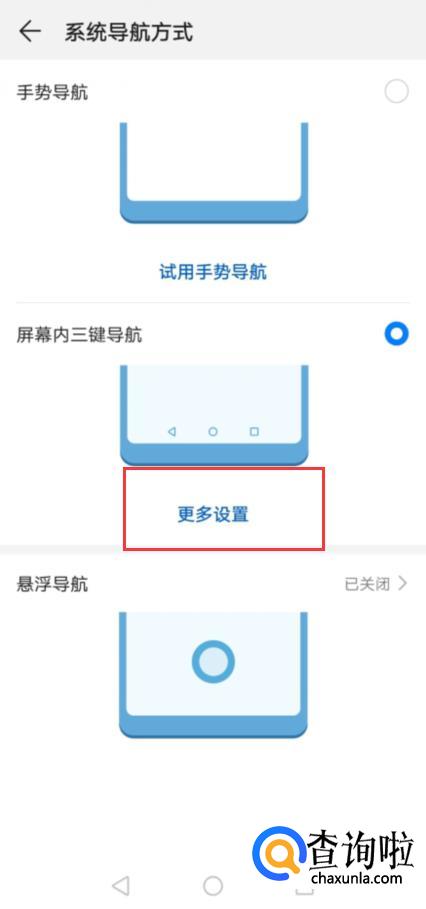 进入系统导航界面后,就可以发现“屏幕内三键导航”,点击三键导航下方的“更多设置”按钮,如下图所示。