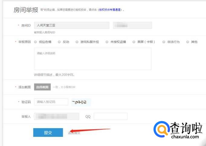 进入到举报页面后我们填写举报的相关的信息,然后点击提交就等管理员处理就可以了。