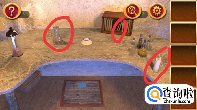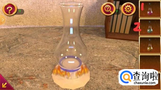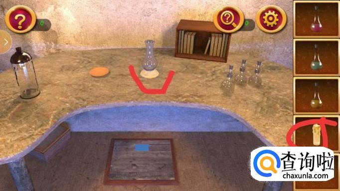 打开左下角的盒子并按照图中箭头所示依次点亮按钮,将会得到蓝色液体