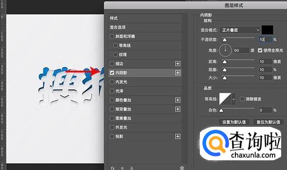 接着双击白色图层进入图层样式,添加10%正片叠底模式的黑色内阴影,根据预览效果进行数值调整。