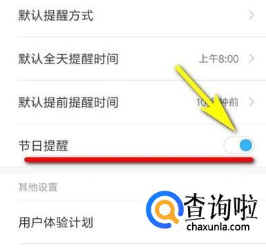 如果你想设置,当到达某个日期时,手机会提醒你,那么,就要把“节日提醒”这一项开启。手指点下“节日提醒”右侧的按钮,按钮呈蓝色状态即为开启状态。
