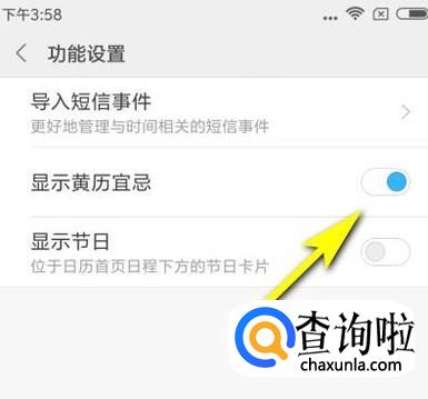 另外,还可以设置日历是否显示黄历宜忌;我们点开“功能设置”转为另一个页面,在这个页面中,我们把“显示黄历宜忌”开启即可。