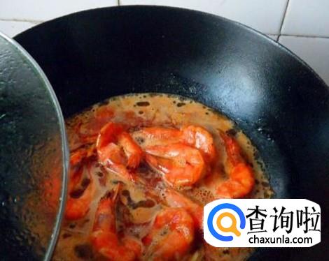 在锅中加入适量的清水,没过虾,然后盖上锅盖,让它慢慢炖出红色的汤汁。
