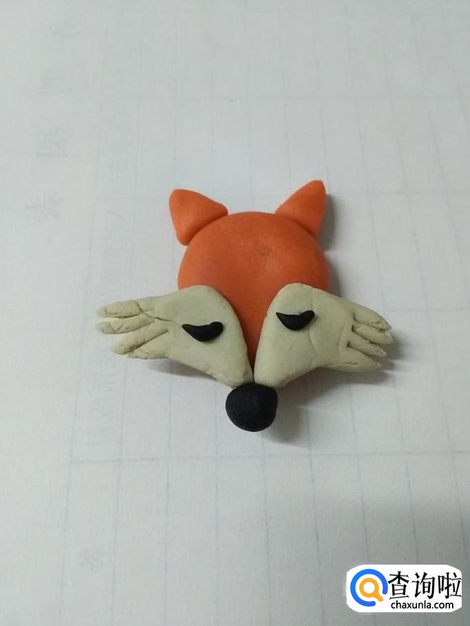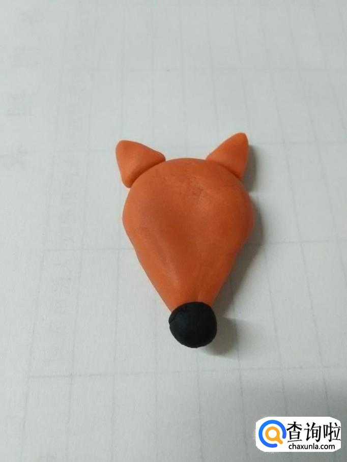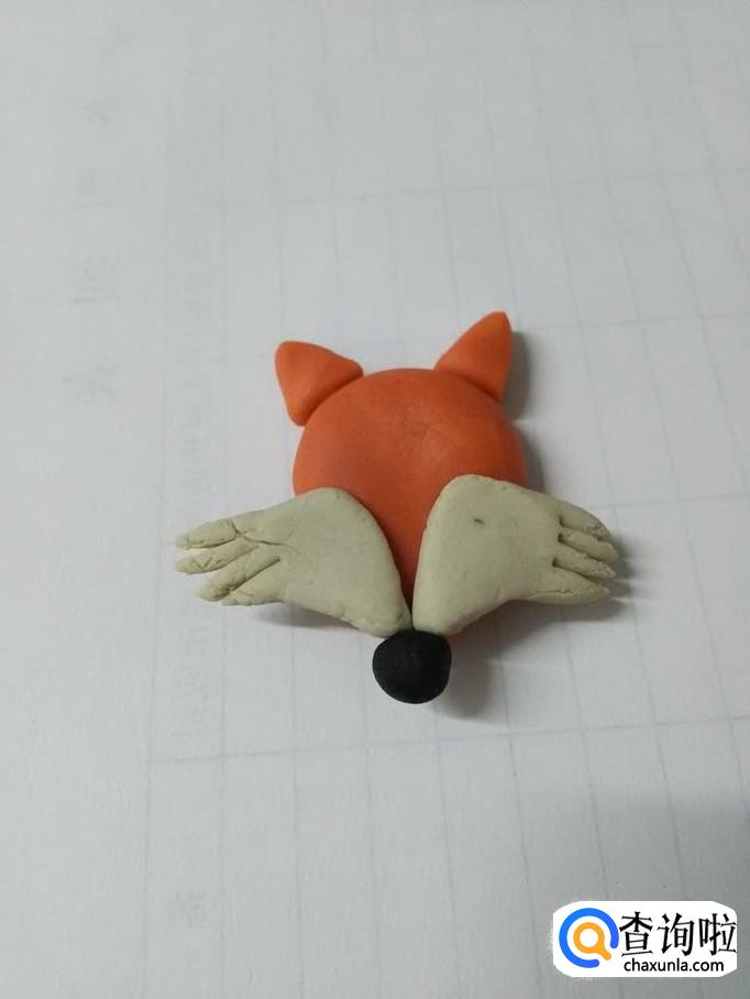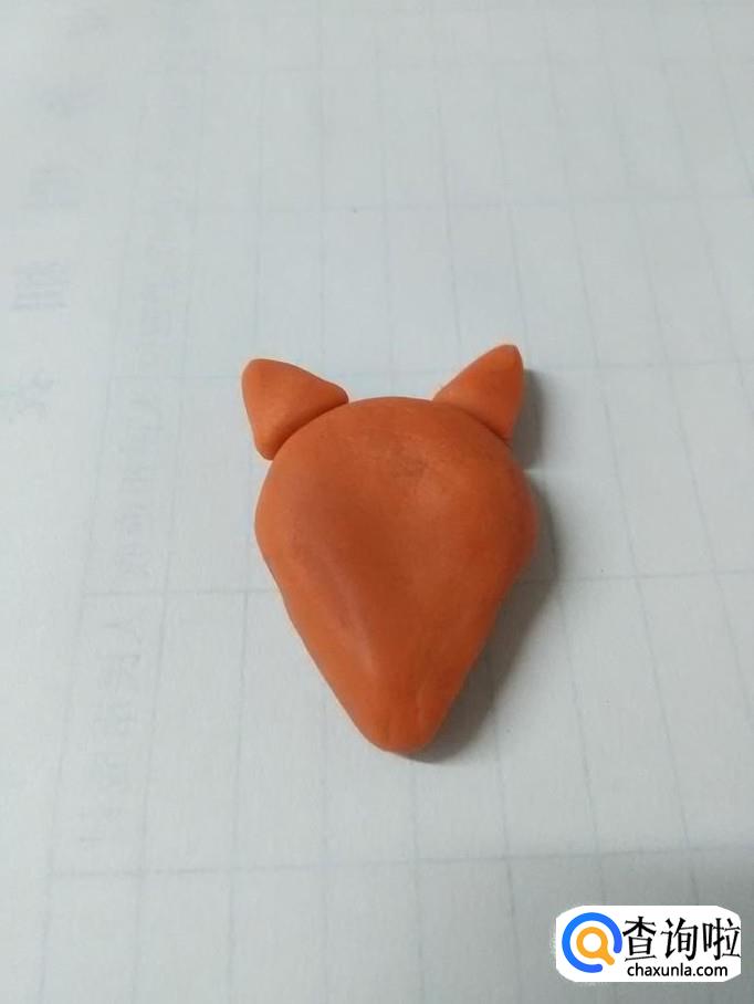 用两块桔红色橡皮泥捏成两个三角形,粘在小狐狸的头顶两侧,当作两只耳朵。