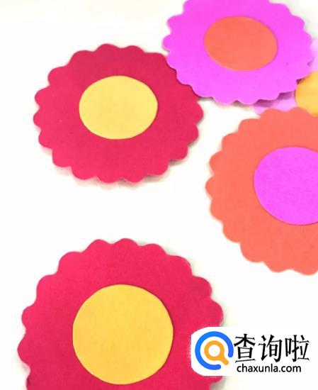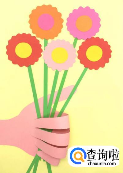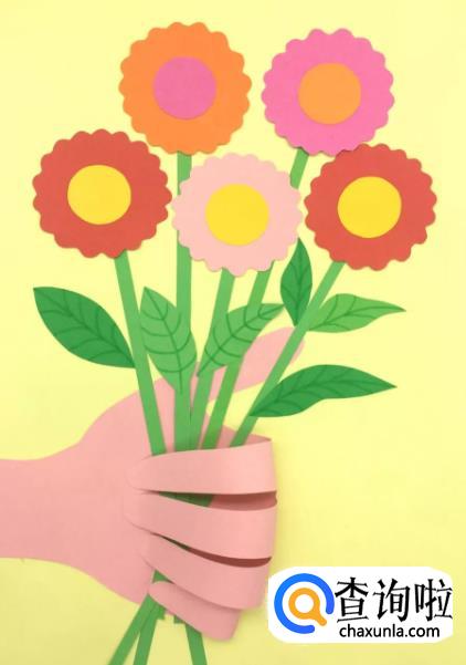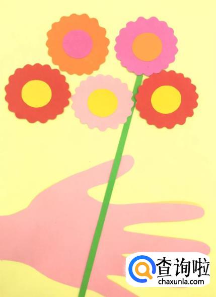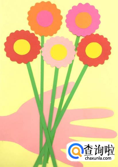 将贴好的花瓣贴在浅黄色的卡纸上,再用浅粉色的卡纸剪一个手的形状(可直接用手在纸上画个外形)