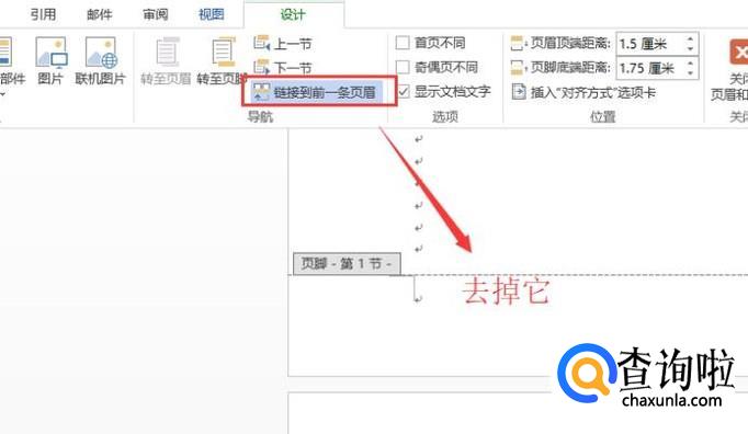 接下来我们点击顶部的设计菜单,将下面的链接到前一条页眉勾选掉,如下图所示