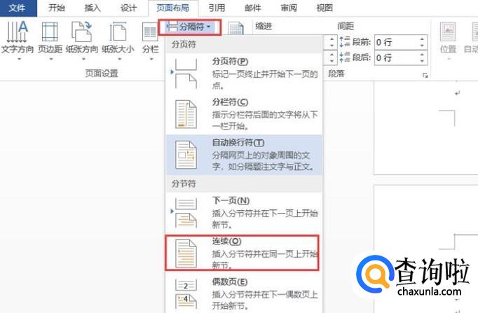 接下来我们点击顶部的页面布局菜单,选择下拉菜单中的连续选项,如下图所示