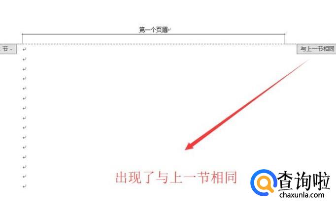 然后我们在第二页中双击页眉区域,你会看到右侧多出来与上一节相同的字样,如下图所示,正是这个让所有页面的页眉都相同的