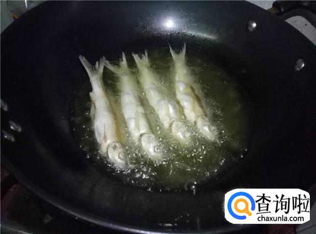 放下小鱼后,不要着急着翻动小鱼,要等到一面炸到金黄色后,再翻另外一面,这样炸出来的小鱼就很酥脆,很好吃了。油炸的小鱼都比较热气,一次性不要吃太多哦。