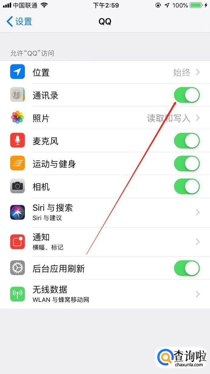 此时,我们看到“通讯录”后的按钮是开启的,点击按钮,变成灰色就是关闭通讯录了。