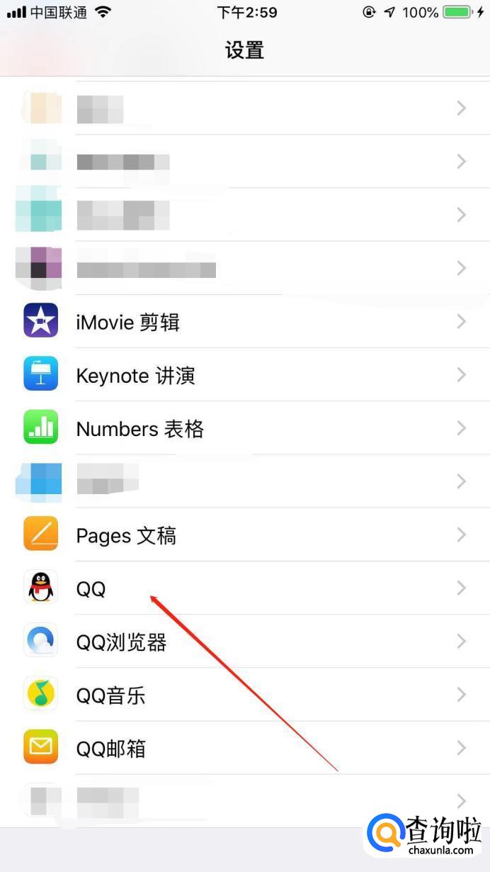 进入“设置”页面以后,找到“QQ”,点进去。