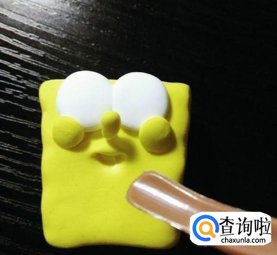 接下来,用白色,黑色等颜色的轻粘土做出海绵宝宝的五官,然后贴在身体上。