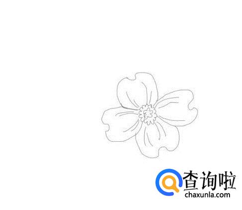 先画出茱萸花的一朵盛开的花朵,然后在上面再画出茱萸花的花心, 如图所示: