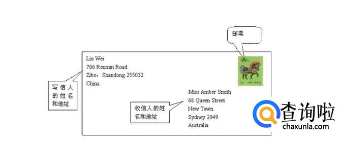 4、住址的写法与中文相反;英文住址原则上是由小至大,如必须先写门牌号码、街路名称,再写城市、省(州)和邮政区号,最后一行则写上国家的名称。