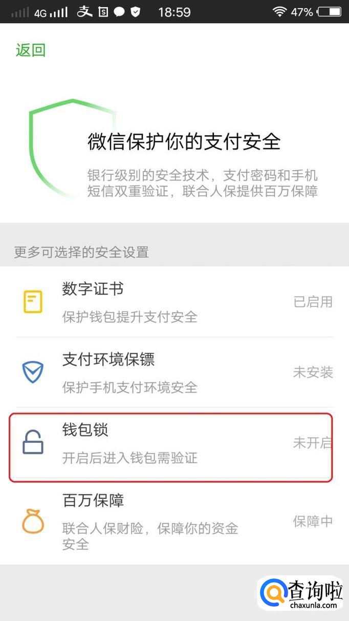 里面是一些安全设置,开启可以保护账户安全,我们点击其中的“钱包锁”,当前是未开启状态。