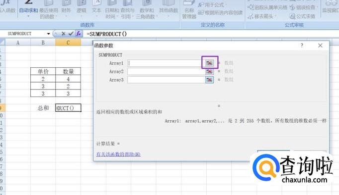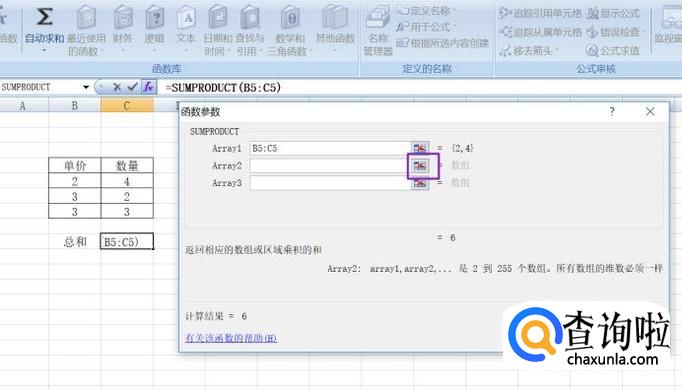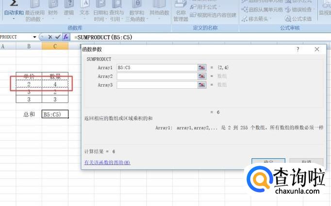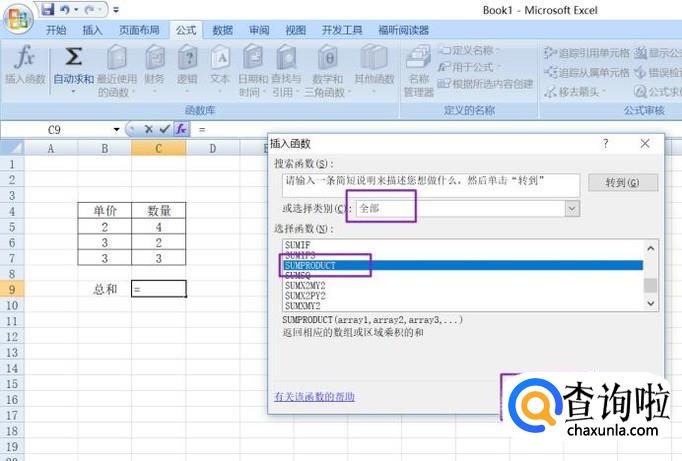 弹出的界面,我们将选择类别设置成全部,然后找到SUMPRODUCT并选中,之后点击确定;