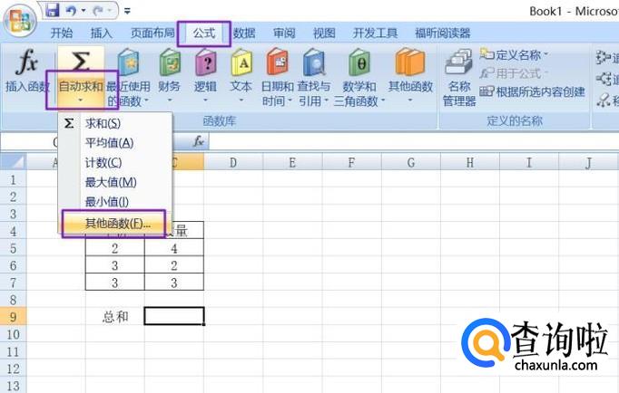 然后我们点击公式,点击自动求和的下拉箭头,然后点击其他函数;