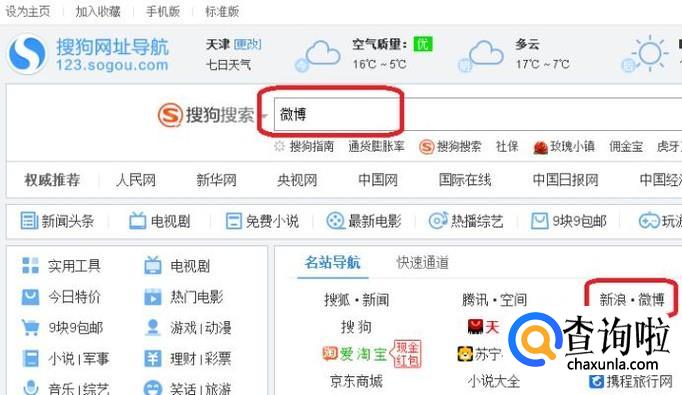 首先,我们需要进入微博,如图所示,可以在搜狗网址导航页直接点击链接进入,也可以通过搜索栏搜索进入。