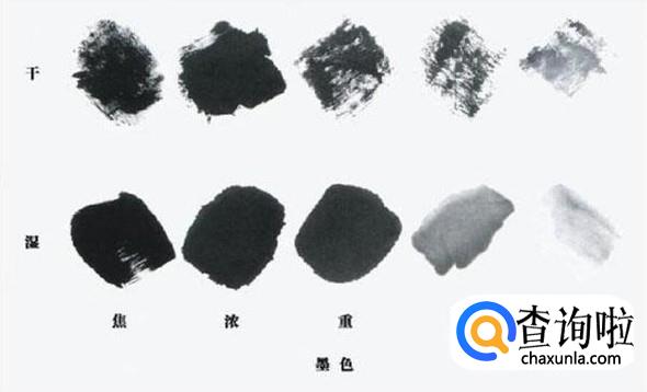 根据墨的深浅可分为焦墨(原墨)、浓墨、重墨、淡墨、清墨五层次,由深到浅,再加上留白,也可以称为六彩。可以根据自己的实际情况自行调颜色,在墨盘中直接蘸上的墨为焦墨,经墨再蘸上水为浓墨,多加水,墨色稍有变化为重墨,水泡合后出现的墨色为淡墨,将笔上的墨用清水涮净,留下来的墨为清墨。