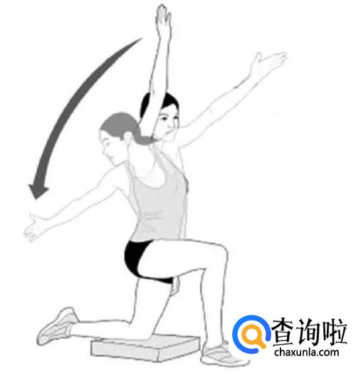然后尽量向后扭转身体,同时右手顺势放下指向脚尖,直到你左髋部有拉伸感,保持30秒;换左腿在前,右膝跪地做。